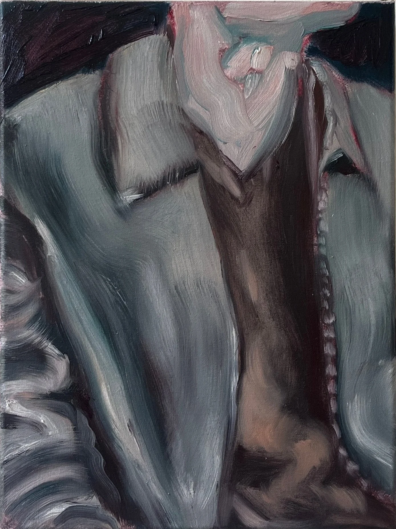 Standing, Safety Instructions, Leather and Pillbox, Oil on canvas, 40cm x 30cm
